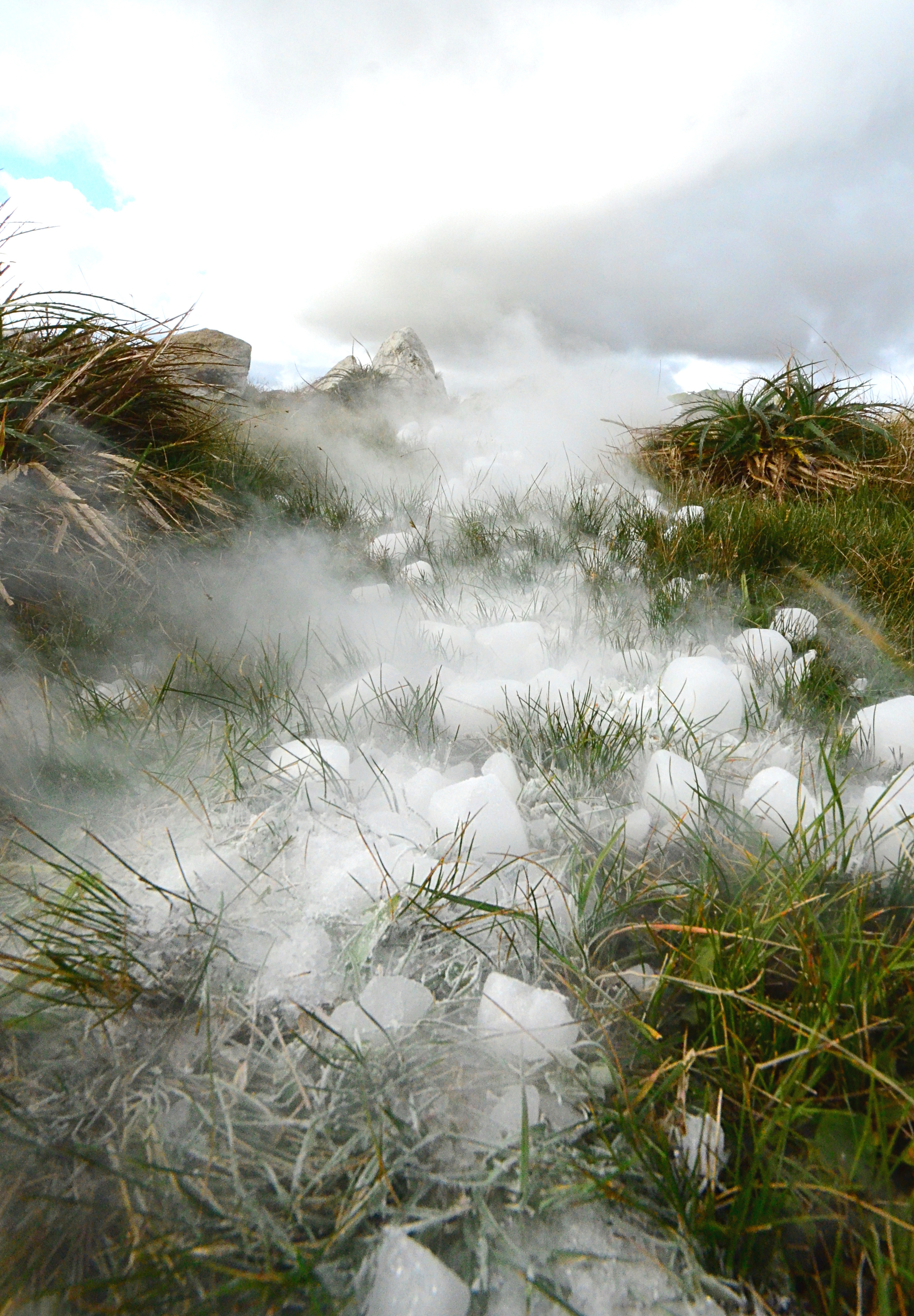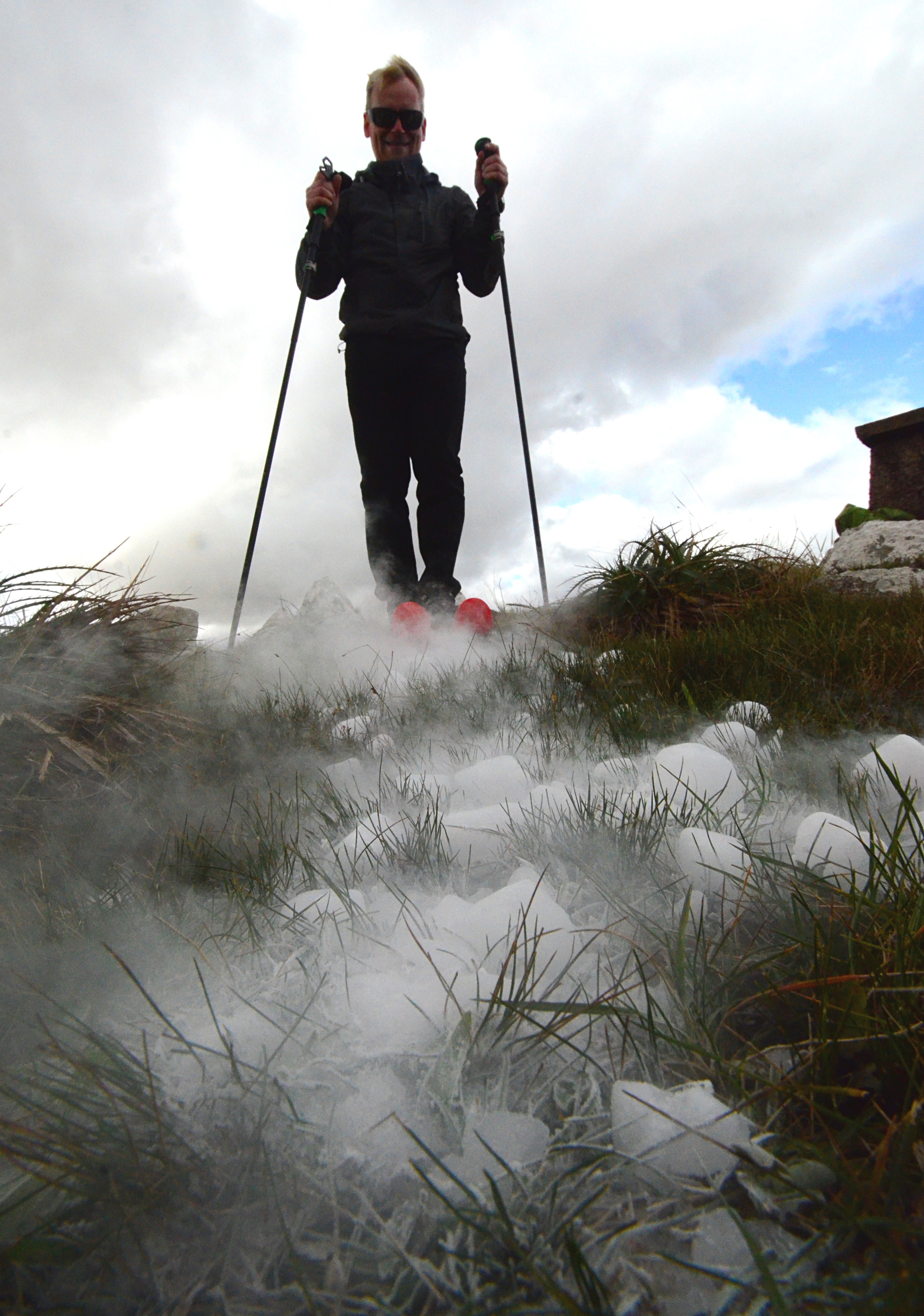 Anyway, the mountains in Uruguay are not just small - they are also free of snow. It snows here maybe once in 20 or 30 years. To counter this problem I had prepared an emergency snow pack, 10 kilos of dry ice. The readers of my blog know that I've experimented with dry ice earlier. But now I am using it for the first time on location. Dry ice fits the purpose better than regular ice, because it stays cold longer and there is no meltwater to wet my backpack. In addition, the smoky dry ice looks more fun in pictures. Dry ice is sold by Praxair in Uruguay, although the large ice blocks that they deliver had to be smashed into pieces by careful application of a heavy rock.