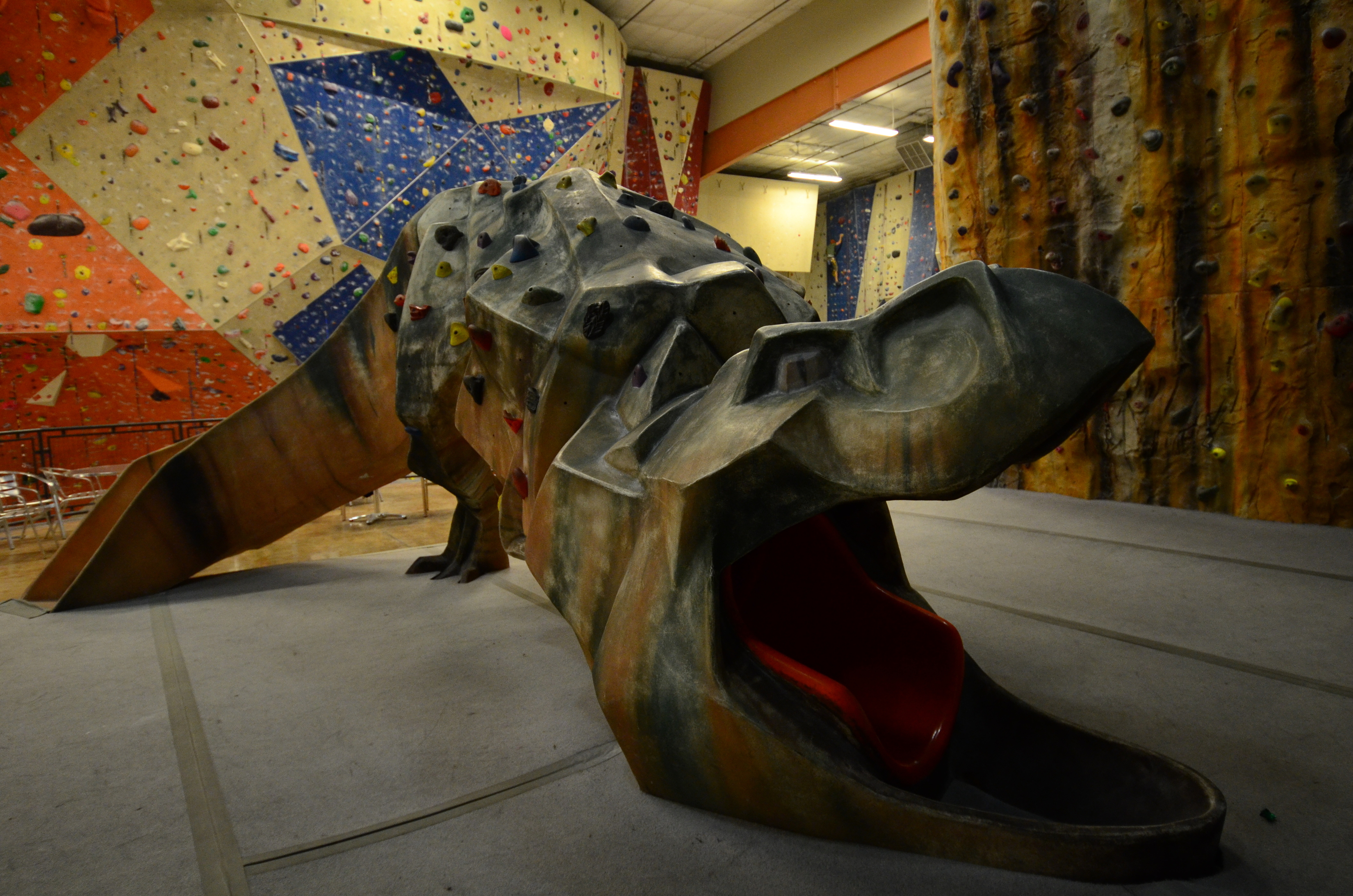 On the second level of the building there is an area for children and beginners. Complete with a dinosaur-shaped climbing feature and a slide. The beginner area has a couple of self-belay routes, all very easy. On the main climbing wall there were two additional self-belay routes, one easy and one going up to 5.10.