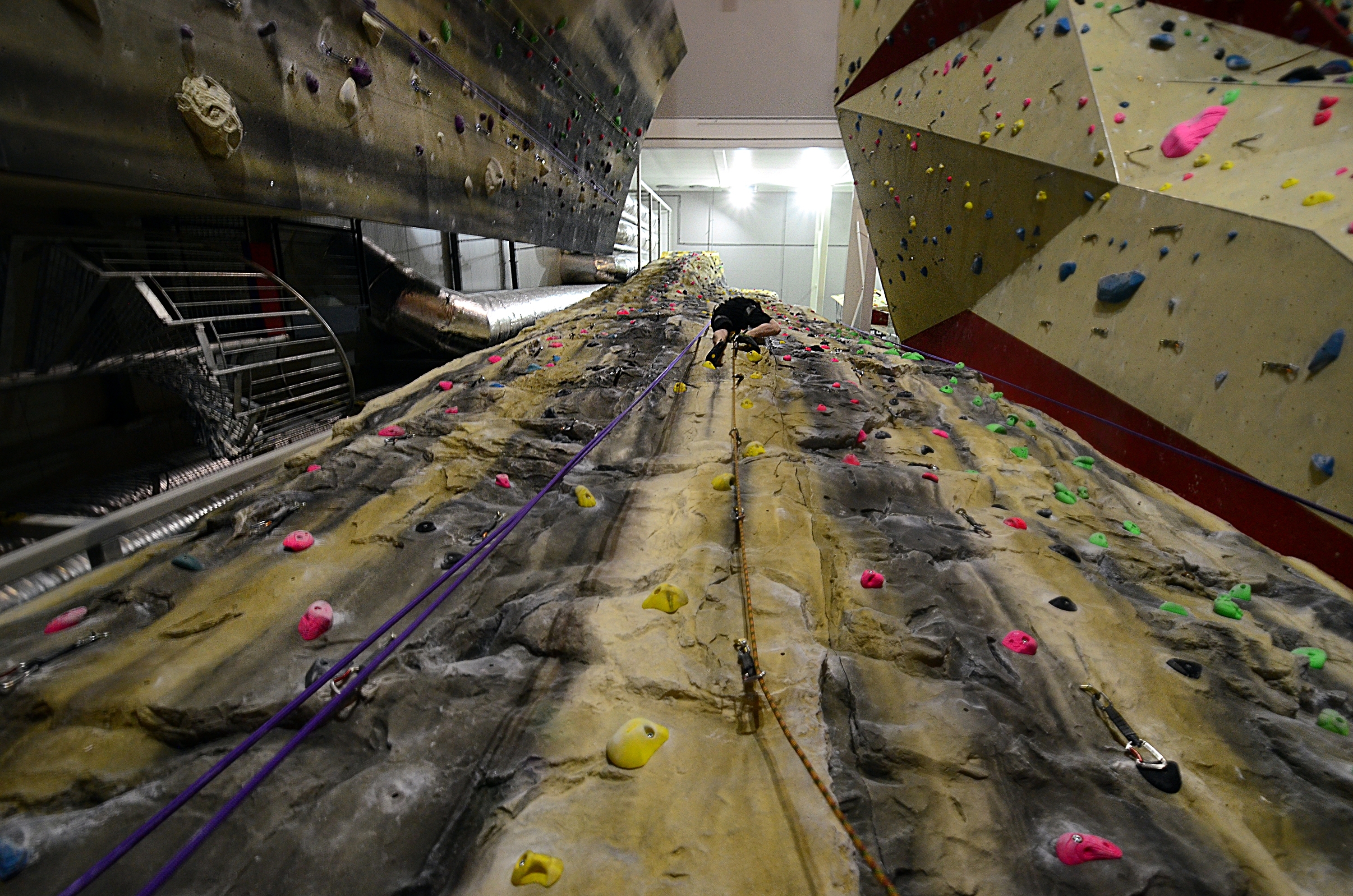In addition to the high wall, the bottom part of the hall houses a 16-meter competition wall and a number of other walls for varied use. There are 7 self-belay routers ranging from 10 to 14 meters, designed both for beginners and more advanced climbers, with grades ranging from 5.4 to 5.12.