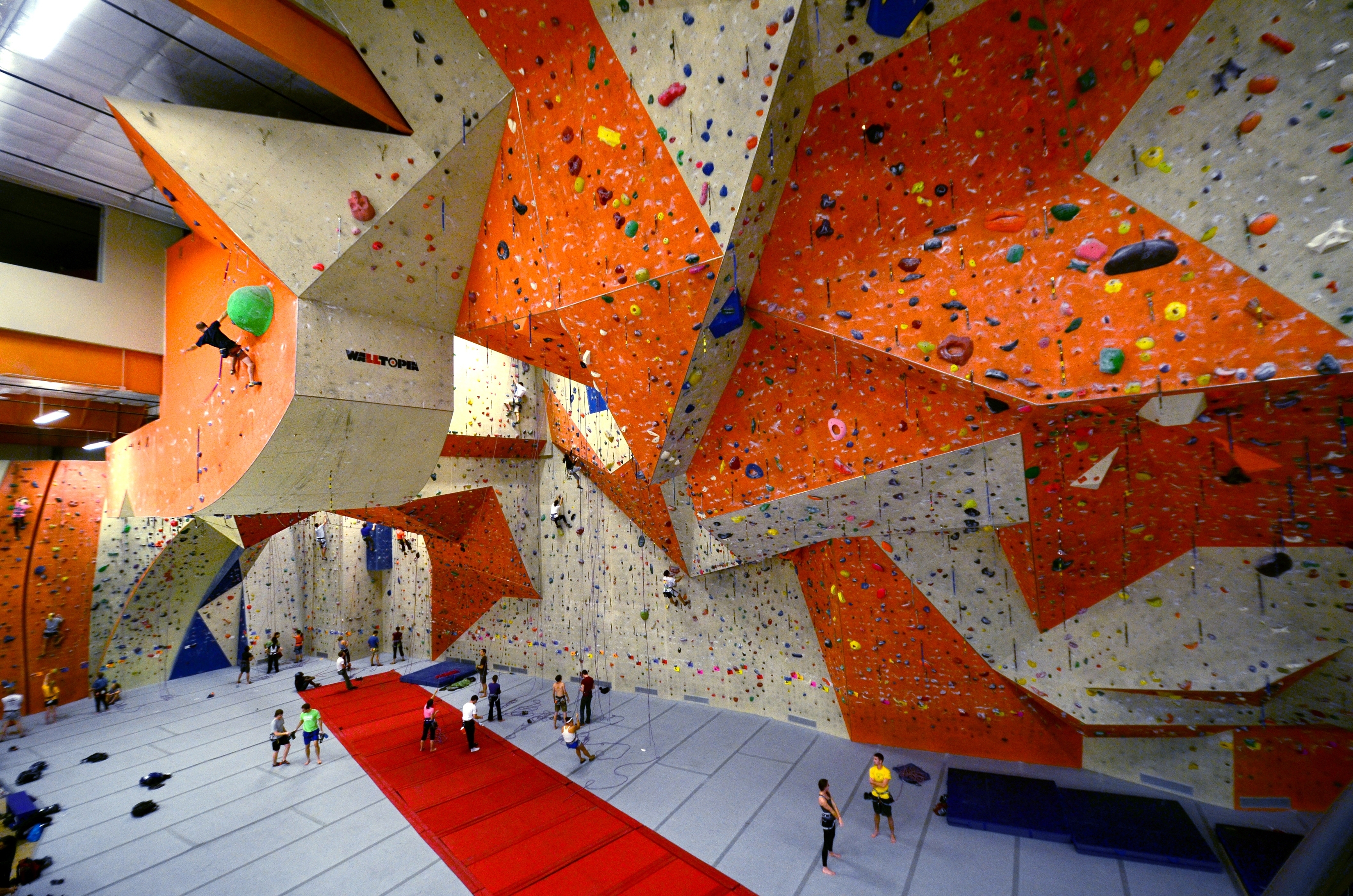The highest wall, Rocktopia, goes through all the floors and is 29 meters. As far as I know, this is the highest indoor climbing wall in the world. High enough that there are some special rules for climbing on this wall. All routes to the top require leading. But at 29 meters, a 50 meter rope is not sufficient for going up and coming back. If you use a too short rope and do not notice it, your rope may run out from the belay device as you are descending. This would result in a fall from 10 meters. To prevent this, climbers are required to attach the other end of their rope to the wall before they start the climb.