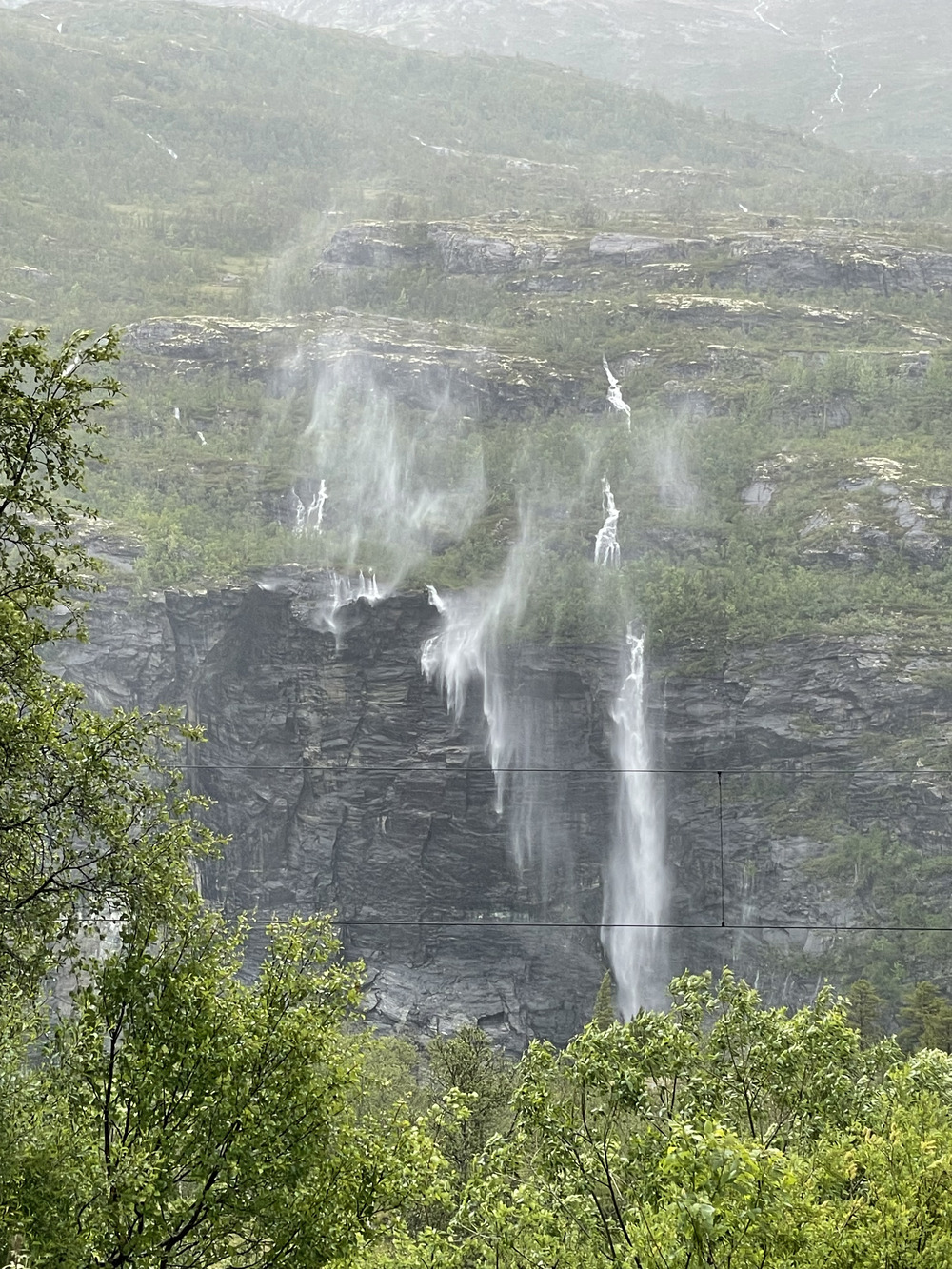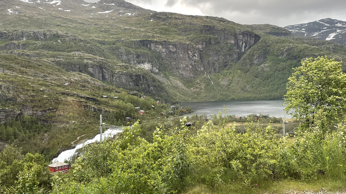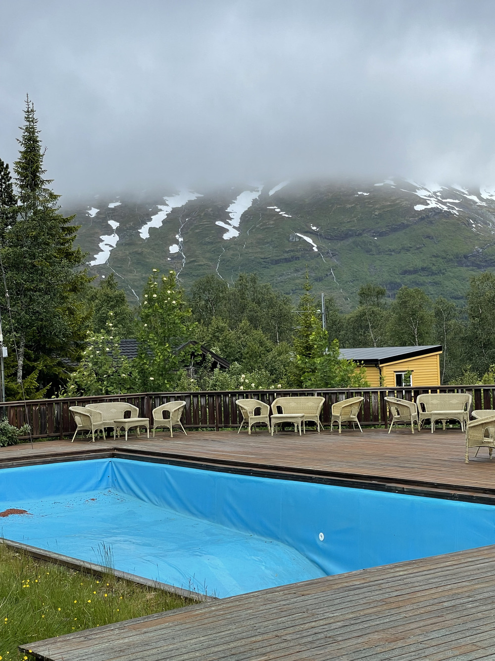 There's even a swimming pool... but it was empty. I found myself thinking what this place looked like in the summer. Of course, it was the middle of the summer, but in the mountains it felt more like the fall. On the rail line from Oslo to Bergen there's plenty of snow around you, even in the middle of summer. Also visible on the mountains from Vatnahalsen. And it can be windy, and is likely rainy. In the opening photo in this article (above), you see how the water from the waterfalls either flies to the right side due to high winds, or even up in the air entirely.