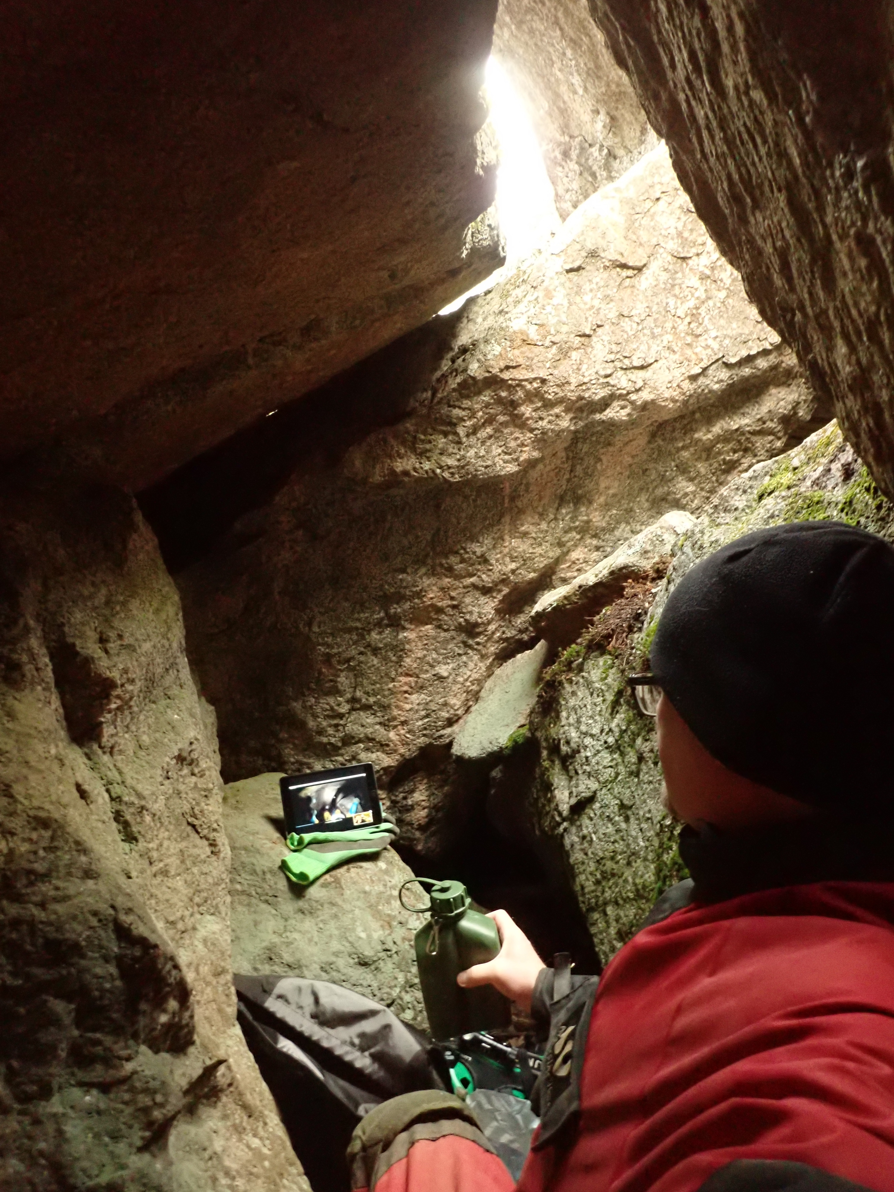 I then proceeded to have the meeting in a carefully chosen under-the-boulders hole that I had not been to previously and that is not in the main cave that might have attracted some hikers during the day. Isolation!