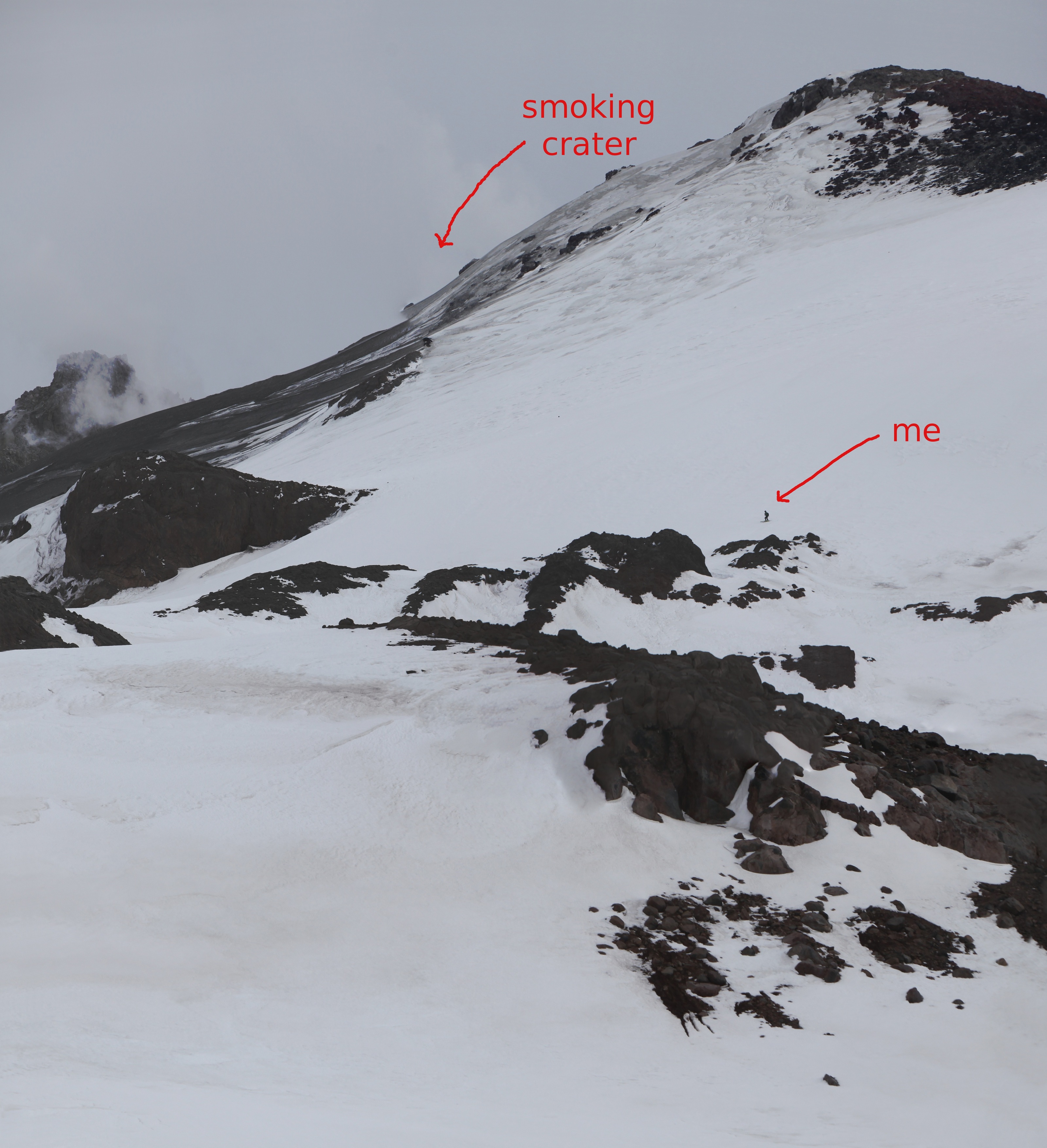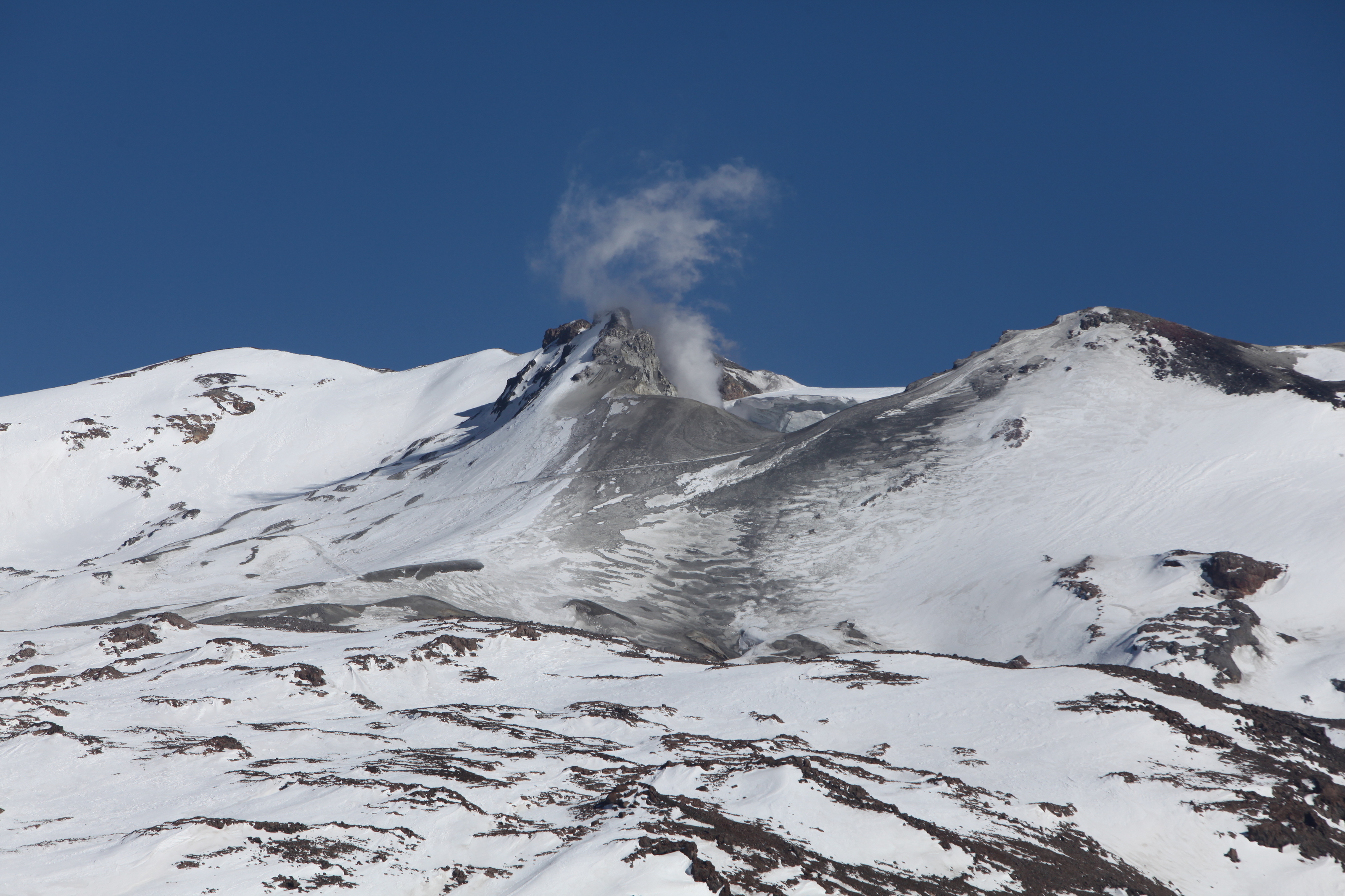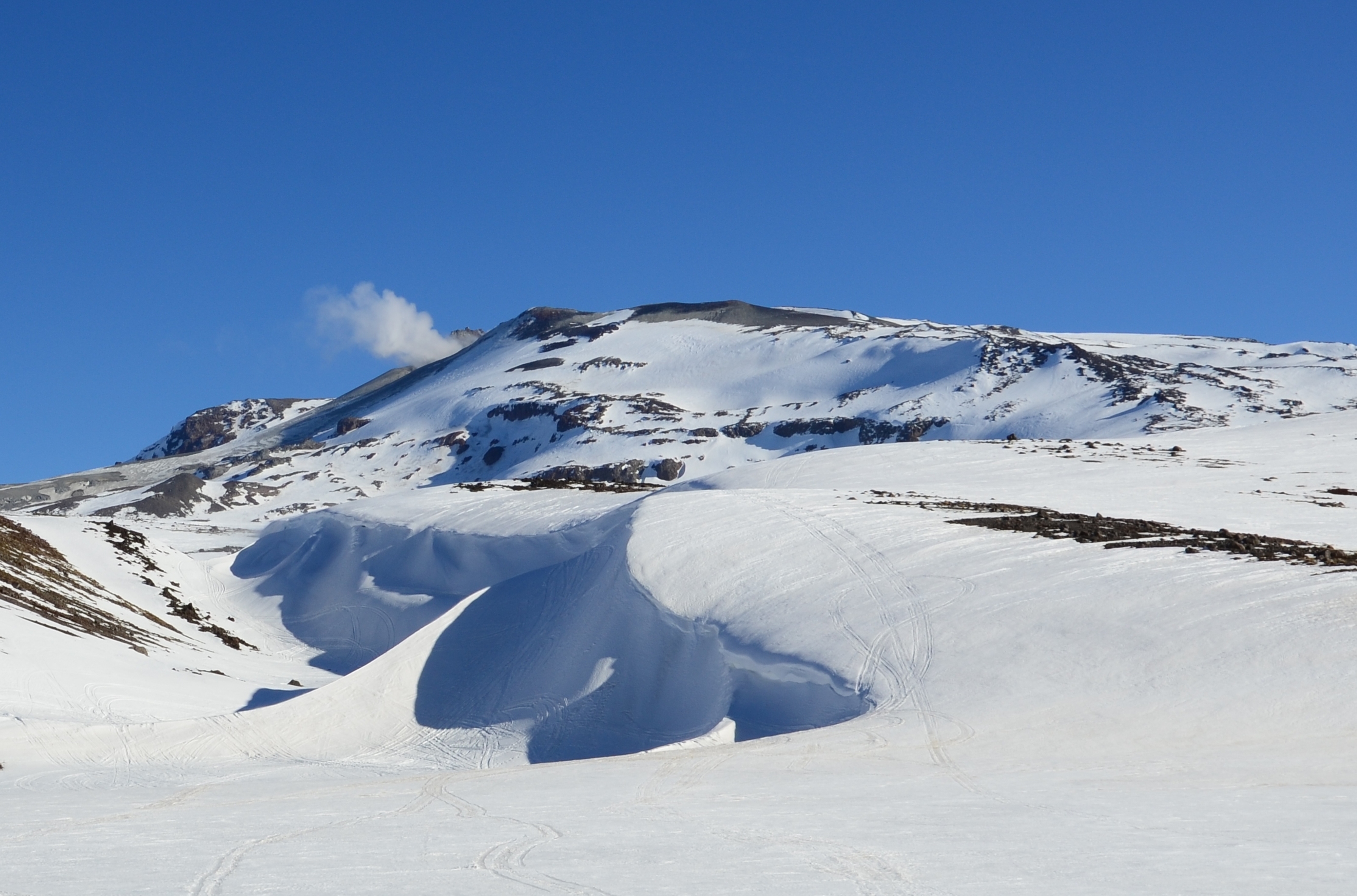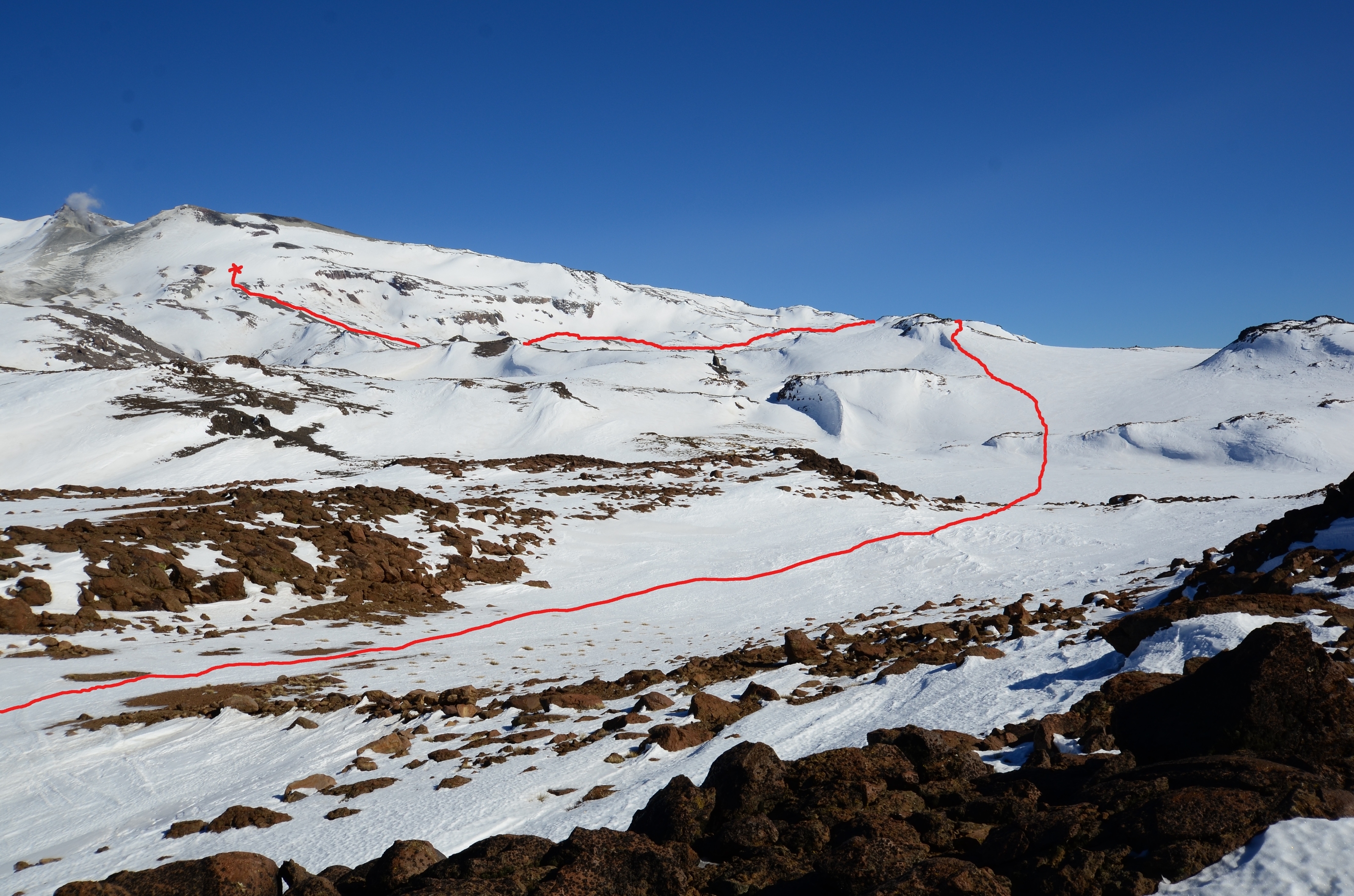 Naturally, we decide to climb to the top on our own. However, our late arrival on the previous night, late wake-up, and the time to return to the car to get our gear delays us, and by the time that we start it is already afternoon. And the peak is far away, there are many kilometers to hike, and the peak is almost a kilometer higher than the highest lift. My friend Tero has some problems with the bindings of his ski touring equipment and he stops as we reach the steeper part of the summit cone, but I continue. But by 5 pm even I give up and turn back to return while there is still daylight. At this point I'm maybe 150 meters away from the crater rim and 300 meters away from the summit. But it is good that I turned back; the return route turns out to be non-trivial, and involves hiking across rock fields. We would have been in trouble without light.