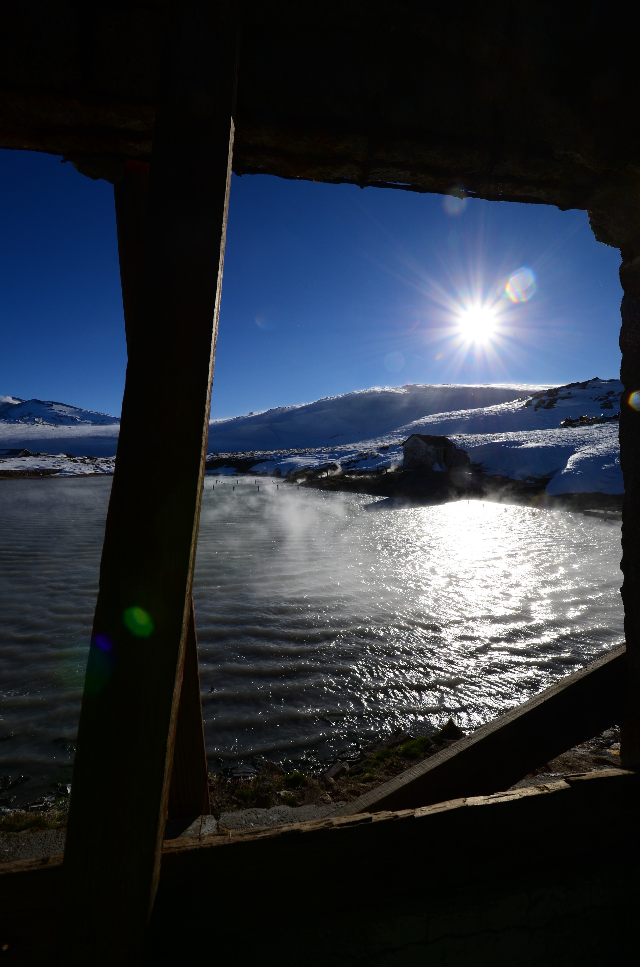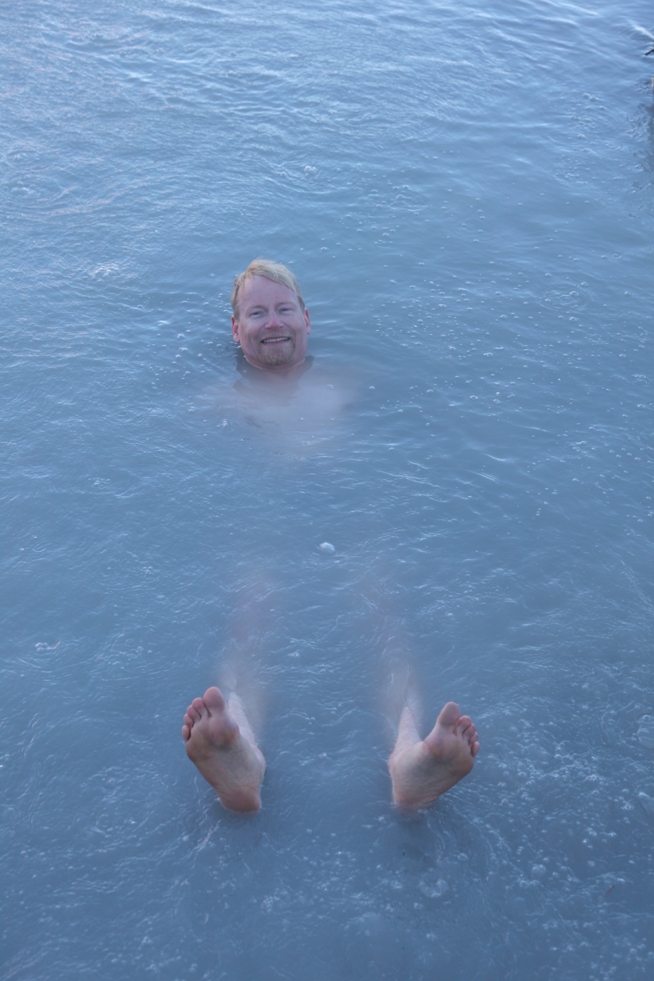It was windy and -10 degrees, but I've come this far, I have to go in. It turns out that the water is warm enough, maybe even too warm. At first I end up sitting on the muddy bottom but quickly realize that is a mistake. My ass is burning from the steam coming from the bottom of the lake. The guide tells me to find a flat stone and sit on top of it.