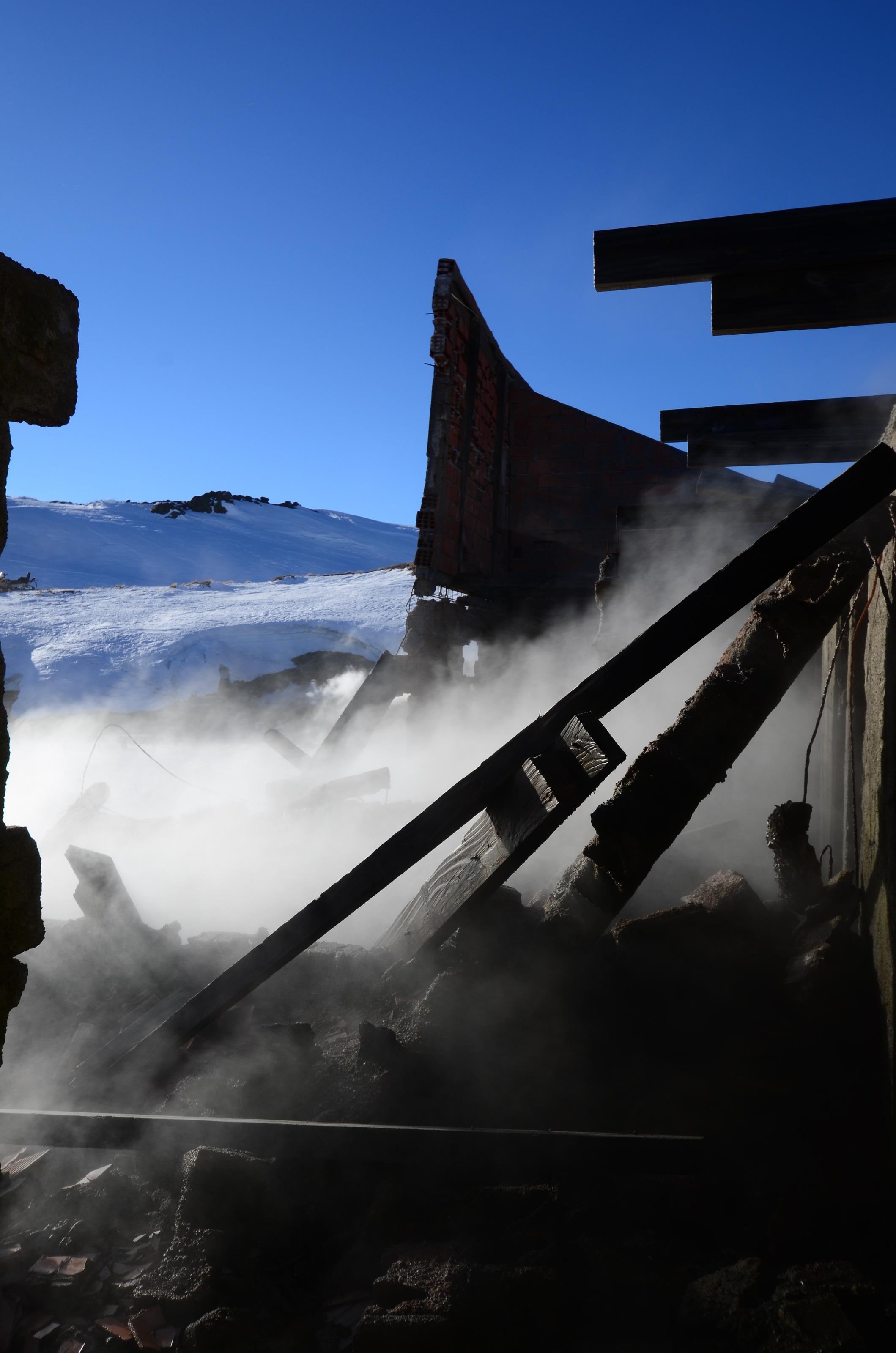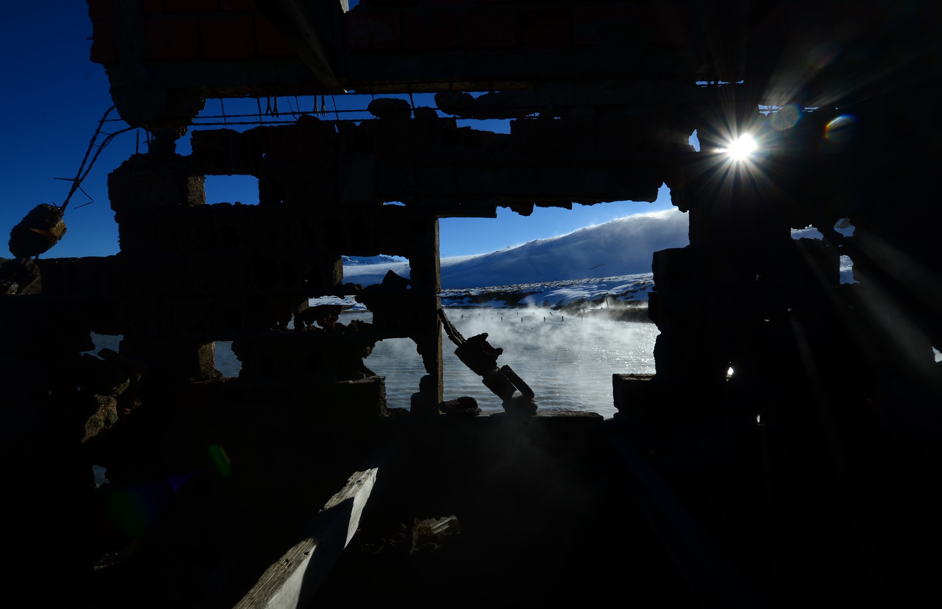 And then we ended up in the Las Maquinitas thermal ponds. There are several hot ponds around the in-the-winter abandoned village of Copahue. We chose to visit a lake that was surrounded by collapsed buildings.