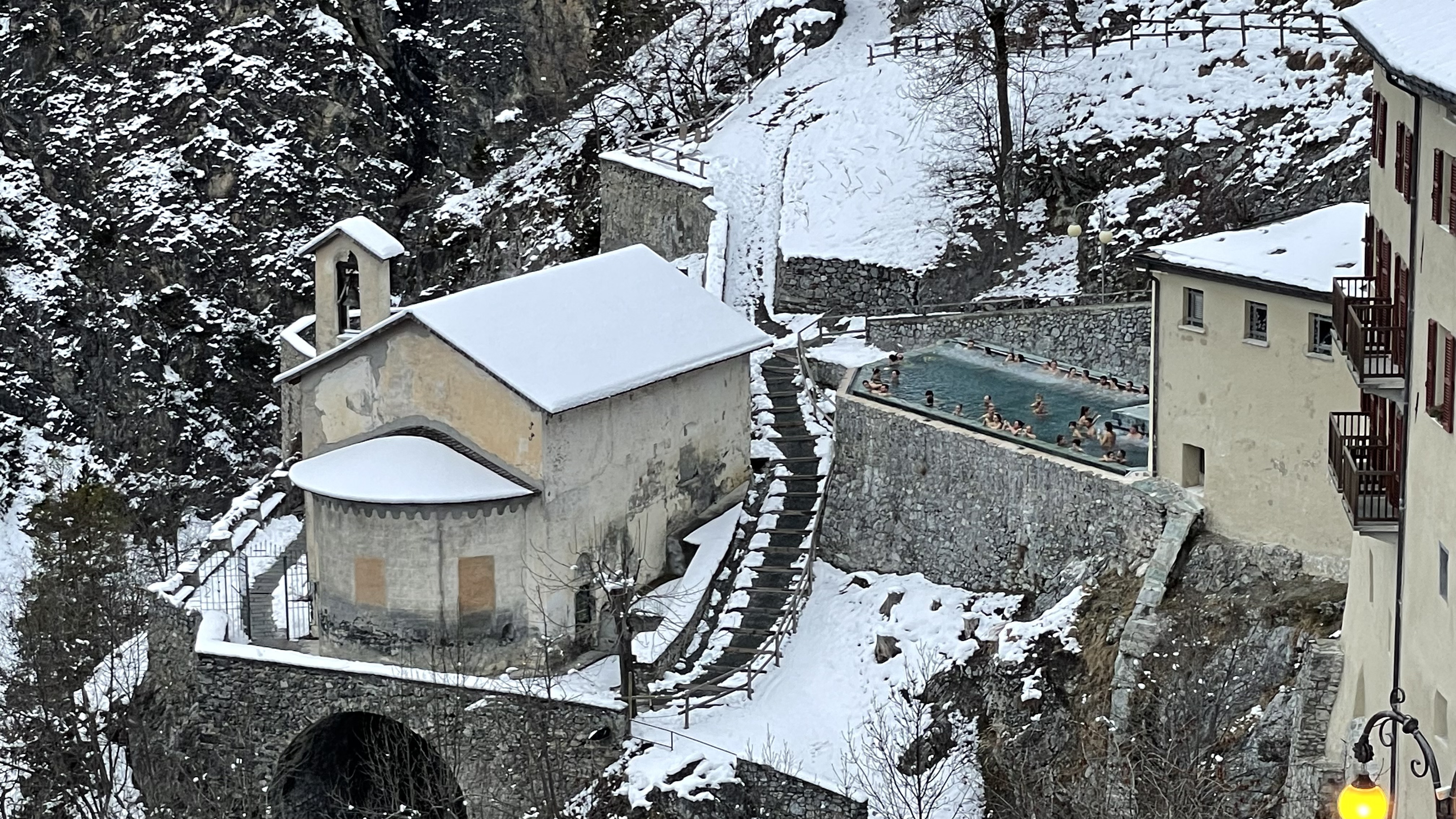 There's a more famous spa in Bormio city center, but ... this is something else: QC Terme Bagni Vecchi. Nestled in the high mountains above Bormio, on the road to the famed Passo di Stelvio... like a castle with indoor and outdoor pools, a sauna in a cave heated by the natural thermal waters.
