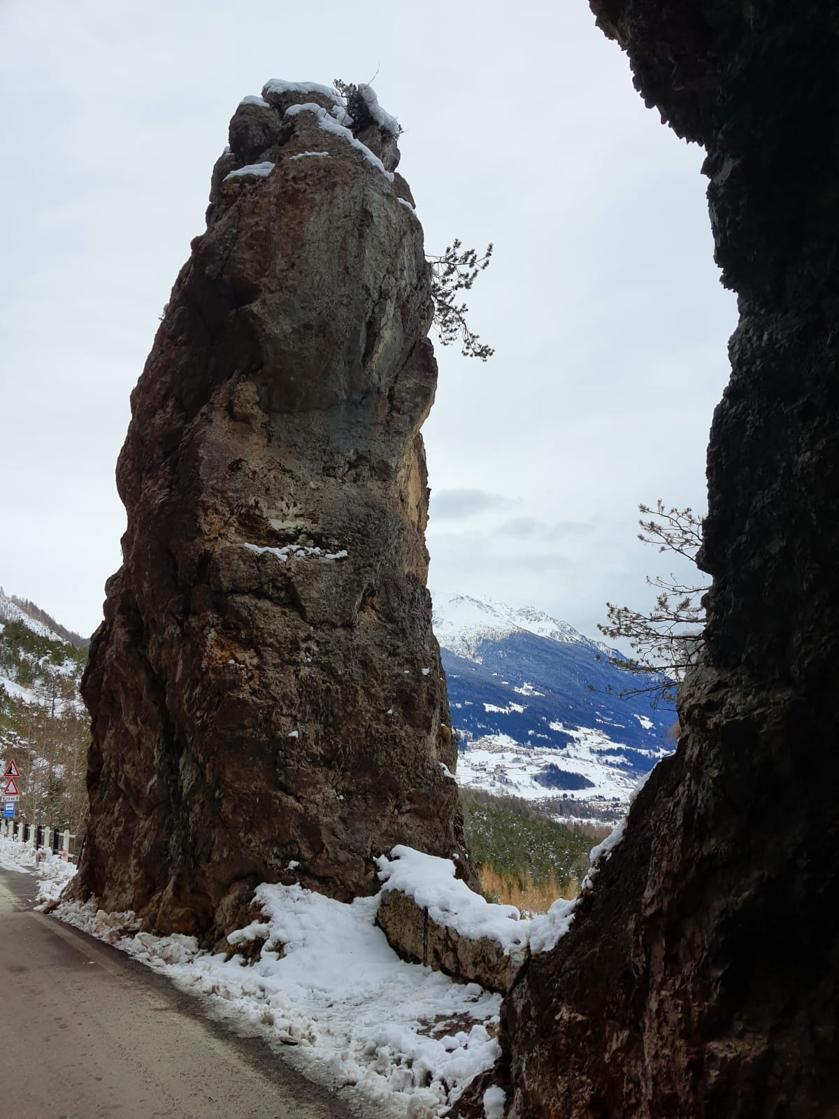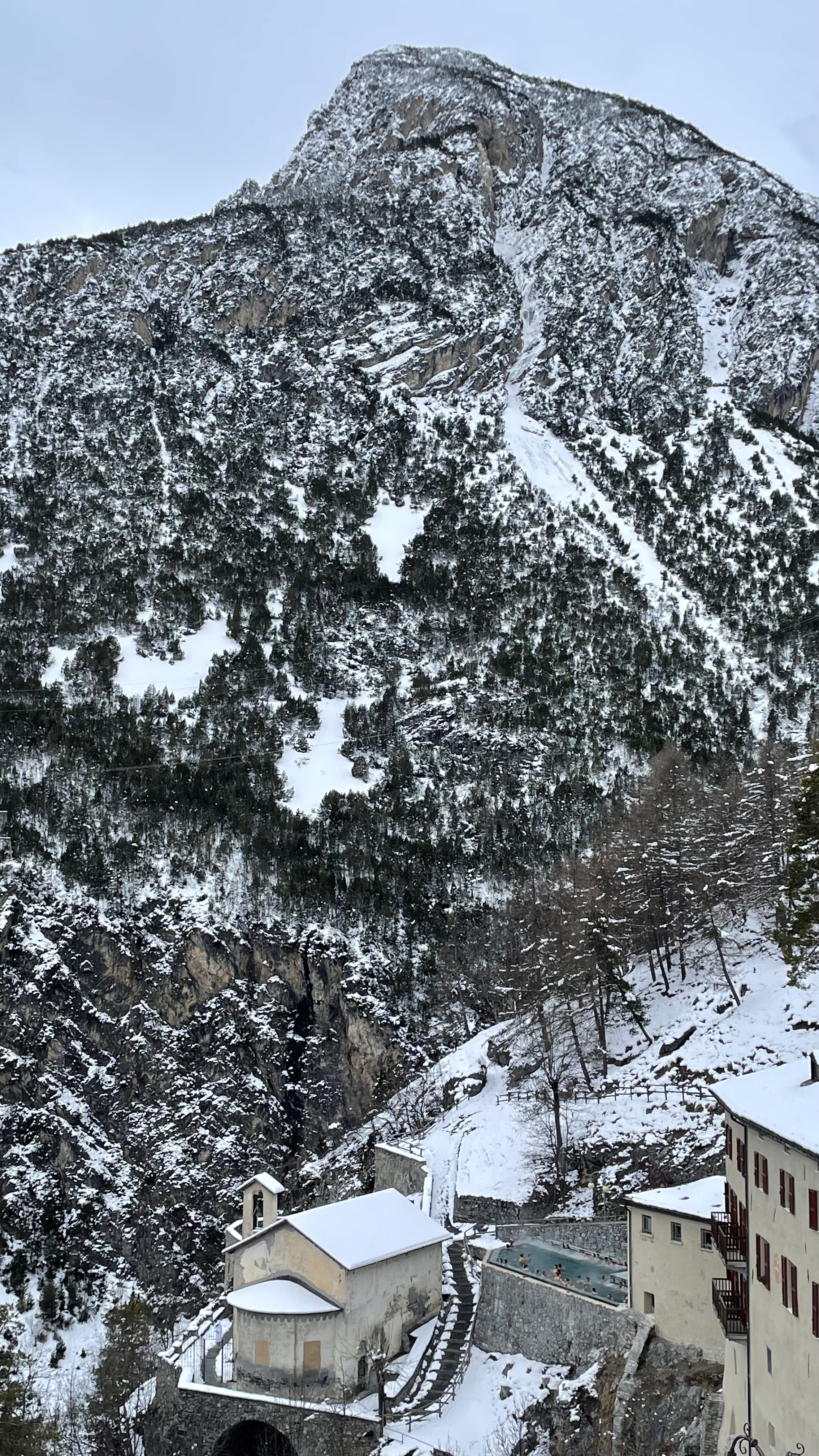 The road to Passo di Stelvio actually stops at this spa in the winter, the rest of it is closed. Here's a spire and a tunnel on the way from the spa down: