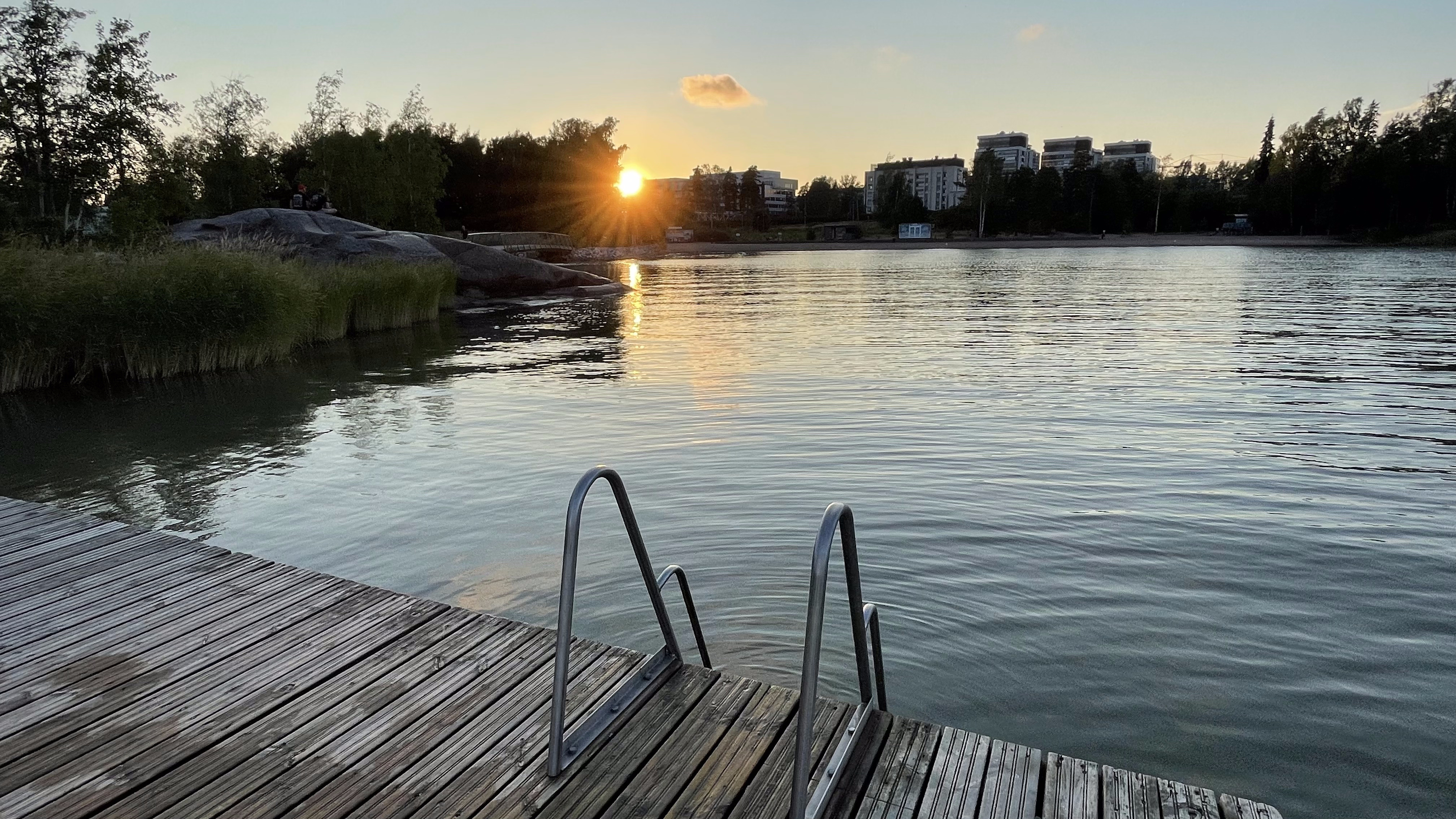 Today's exercise was to visit a beach in Westend, Espoo, where I had not been to before. Unfortunately, the beach was marked as having blue-green algae, and it also looked unpleasantly slimy. But then it turned out that there is a small rocky peninsula, and a pier on it. The water there was a bit more cleaner looking. So I was able to swim!