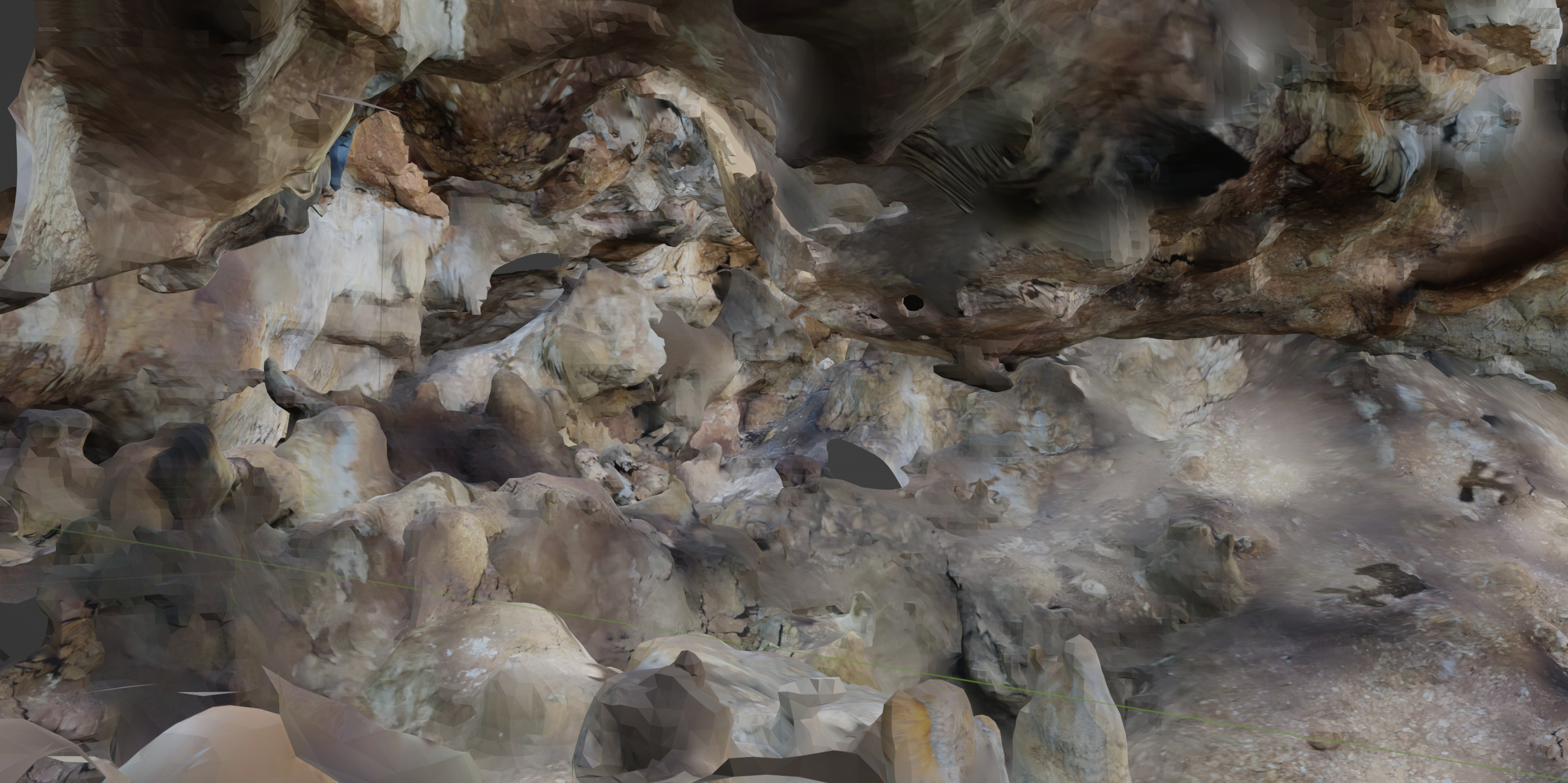 Here's a link the GLTF model. You can rotate the model on your own browser here. A screenshot of the model is below, followed by an automatically generated cave map. The high-res version of the map can be downloaded in PDF here.