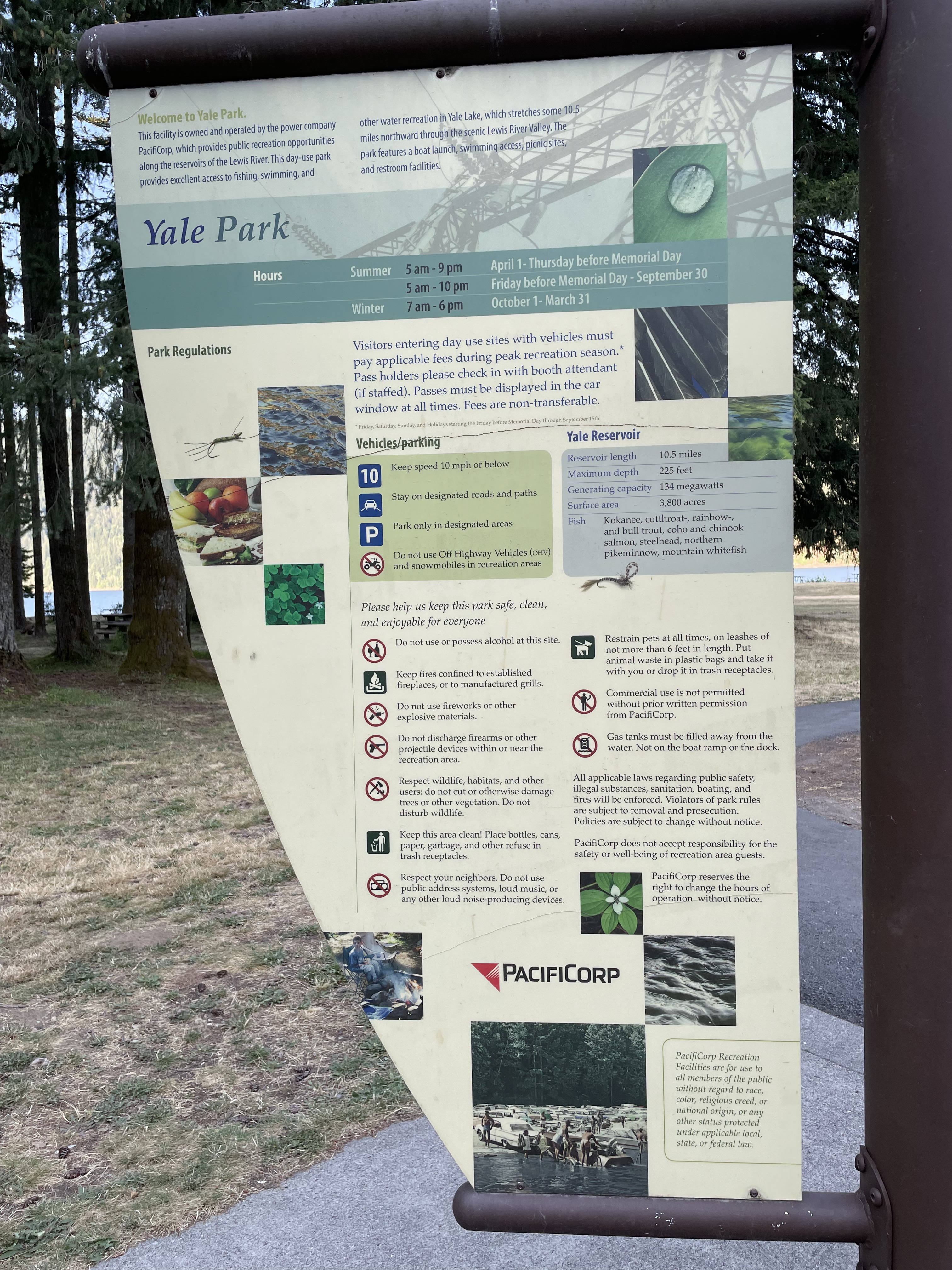 Yale Park is a recreation area by the (artificial) Yale lake in the Lewis River valley. The nearest town is Cougar. The park is part of the agreement for building dams on the Lewis River, and the area is maintained by Pacific Corp, the owner of the dams.