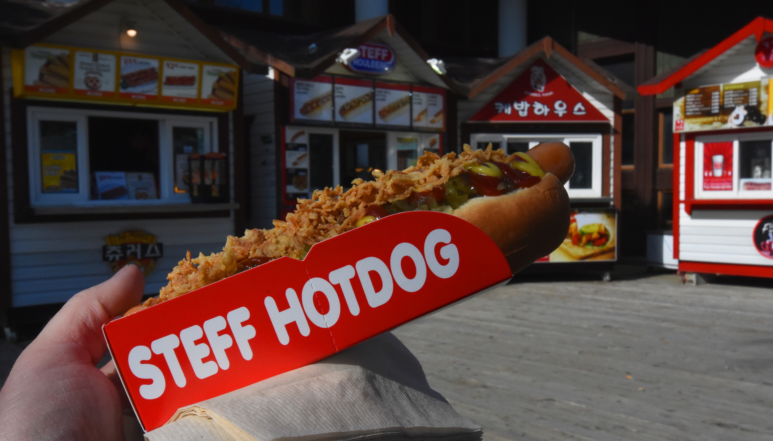 There are plenty of restaurants in the resort, but maybe they are only open during the olympics... I ended finding the only food from the hot dog stand outside. It was good though. Also, interestingly, the local approach seems to be relatively low cost food and drinks in the resorts. A can of soft drink costs less than a dollar, 70 times less than a day ticket. And there was also a grocery store in the main resort building. Very useful!