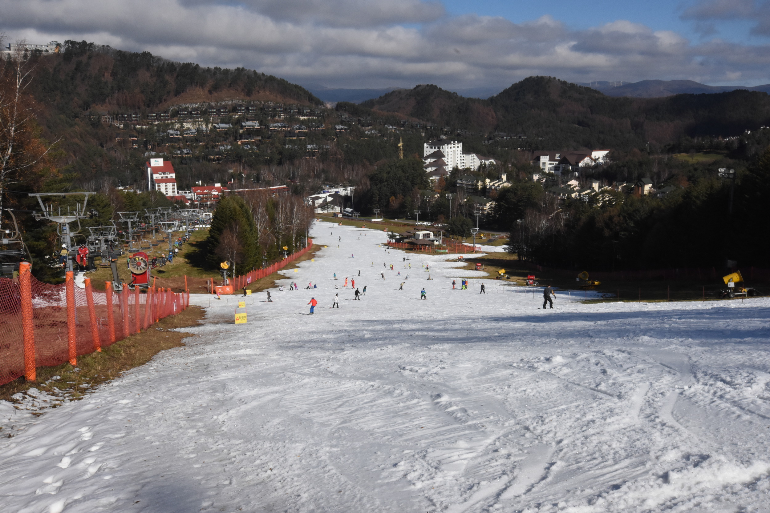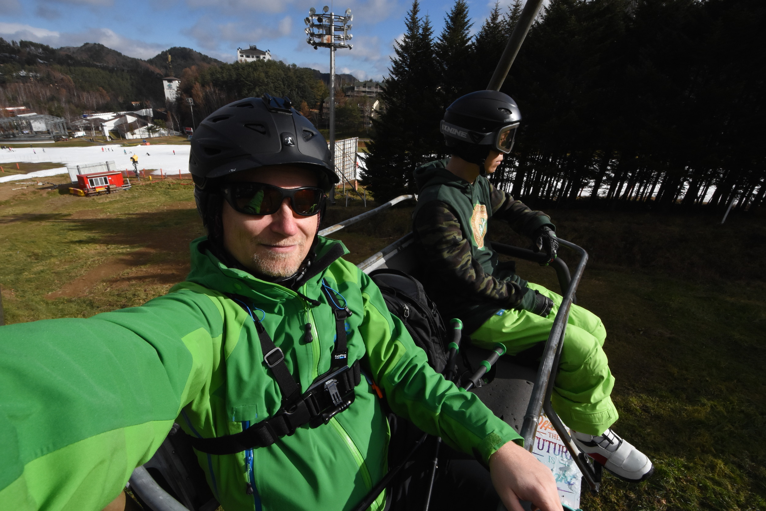 And it was good. The mountain had no natural snow yet, but one slope was open with the help of snow making, and another one was in the making. Good, sunny start for my ski season! I did not have opportunity to test the rest of the mountain, wondering a bit what the competition slopes will be like. There is over 700 meters of vertical, but the open slope was of course for beginners, so fairly flat. The area seems also nice for tree and off-piste skiing, given large areas of forest within the resort.