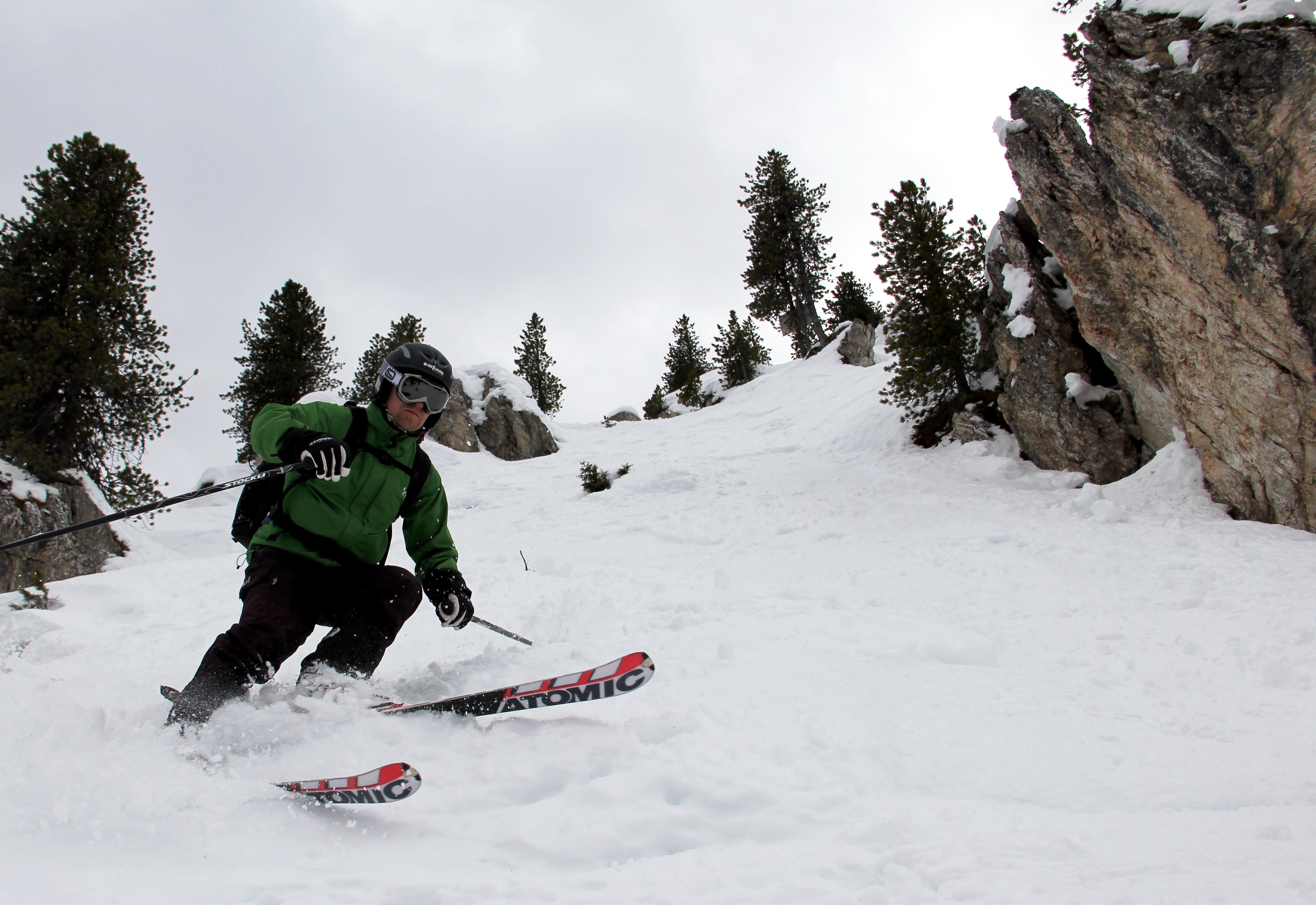 There are also very nice runs in theHochfügenarea, long, steep red runs, 700 meter vertical on one quick chair lift. The area also has a self-service GS race track, courtesy of BMW. From this area you can also access some easy off-piste runs. For instance, traverse the ridge right from the top of the Hochfügen 2000 chairlift. This gives access to a small bowl with a few steeper sections. You can reach the bottom of the lift just by skiing along the fall line.